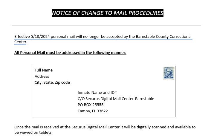 Effective 5/13/2024 personal mail will no longer be accepted by the Barnstable County Correctional Center.