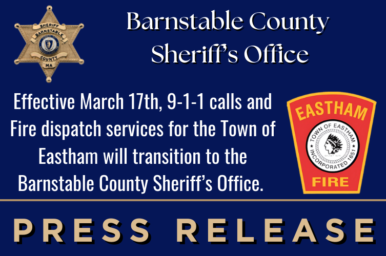 The Town of Eastham and the Barnstable County Sheriff's Office are pleased to announce that effective March 17, 2025, all Eastham 9-1-1 emergency calls and Eastham Fire/EMS dispatch services will transition to the Barnstable County Sheriff's Office (BCSO) Regional Emergency Communications Center.
